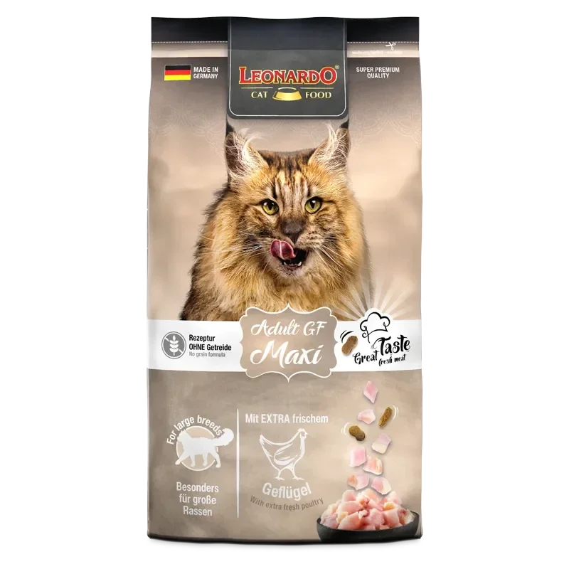 Grote kattenrassen zoals Noorse Boskatten of Maine Coons hebben speciale voedingseisen; de grote maxi-brokken van LEONARDO Adult GF Maxi houden je kat langer bezig, zorgen voor een speciale gebitsreinigende werking en stimuleren de speekselproductie. Met dit graanvrije recept en extra vers gevogelte bied je daarnaast een dagelijks smaakvol hoogtepunt.
