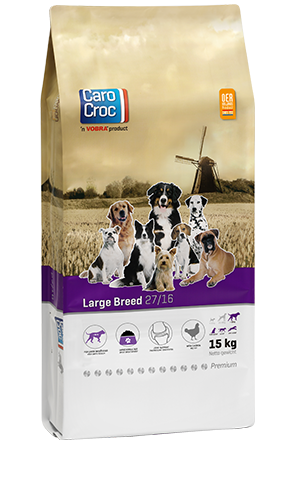 Honden van grote rassen schrokken over het algemeen vaker en dat vergroot de kans op maagkanteling. CaroCroc Large Breed is een extra grote brok van 25 mm. Zo wordt het schrokgedrag van jouw viervoeter verminderd. De grote en vaak krachtige lichamen van grote honden zijn ook gevoeliger voor gewrichtsslijtage. De bestanddelen van de brokken zorgen voor een goede ondersteuning van de botten en het kraakbeen. Hiernaast bevat CaroCroc Large Breed een optimale omega-3 en -6 verhouding, wat zorgt voor een stralende huid en vacht.